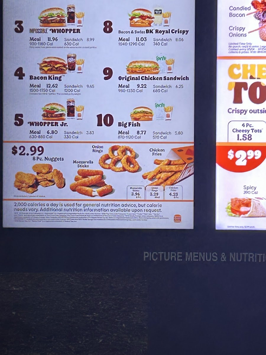 (4) Whopper Sandwiches or Original Chicken Sandwiches, (4) Medium Fries or Medium Onion Rings (Comes with one Zesty dipping sauce), (1) 8 Pc. Nuggets (Comes with choice of up to two sauces)